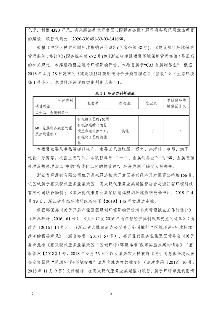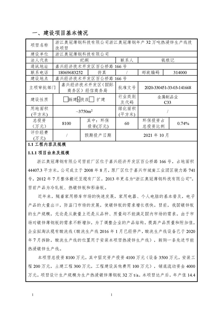 浙江奧冠薄鋼科技有限公司 浙江奧冠薄鋼年產(chǎn)32萬(wàn)噸熱浸鋅生產(chǎn)線技改項(xiàng)目 環(huán)境影響評(píng)價(jià)公告信息